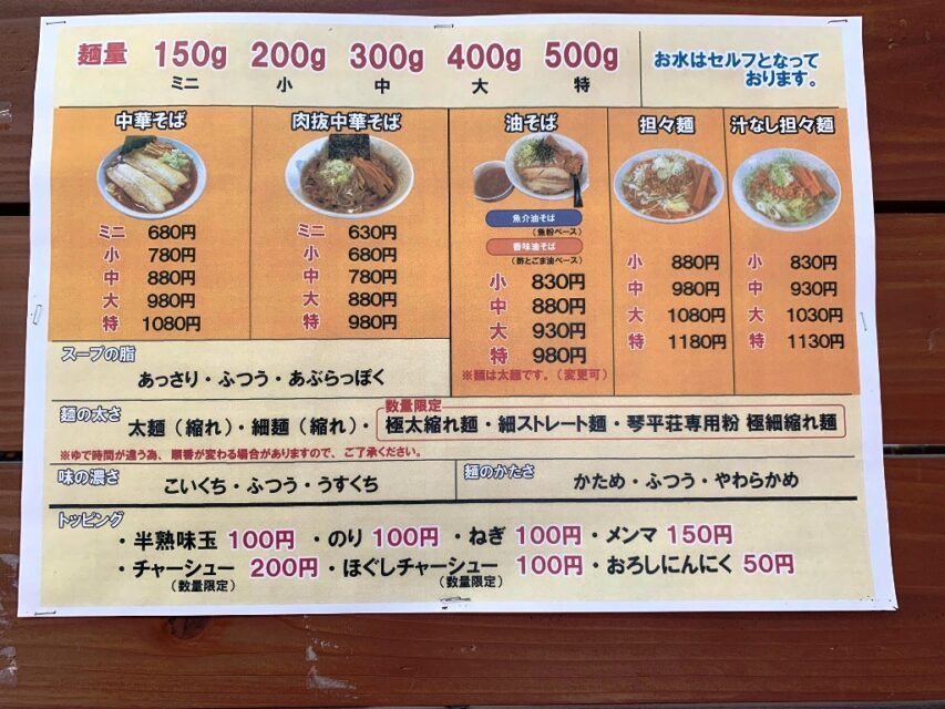 「極太麺硬め、小盛り、油抜き、海苔でお願いします」と伝えます。