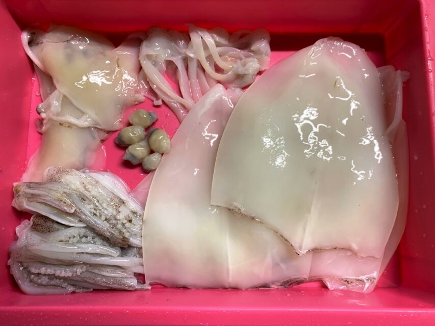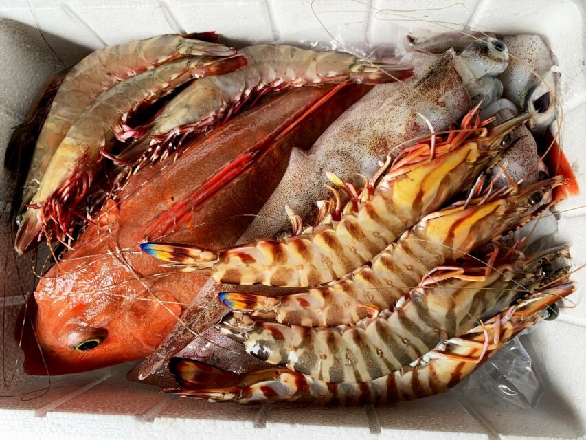 ダン吉海老、プーさん海老、剣先と槍のスクイッド。あとは大き目なホウボウ。